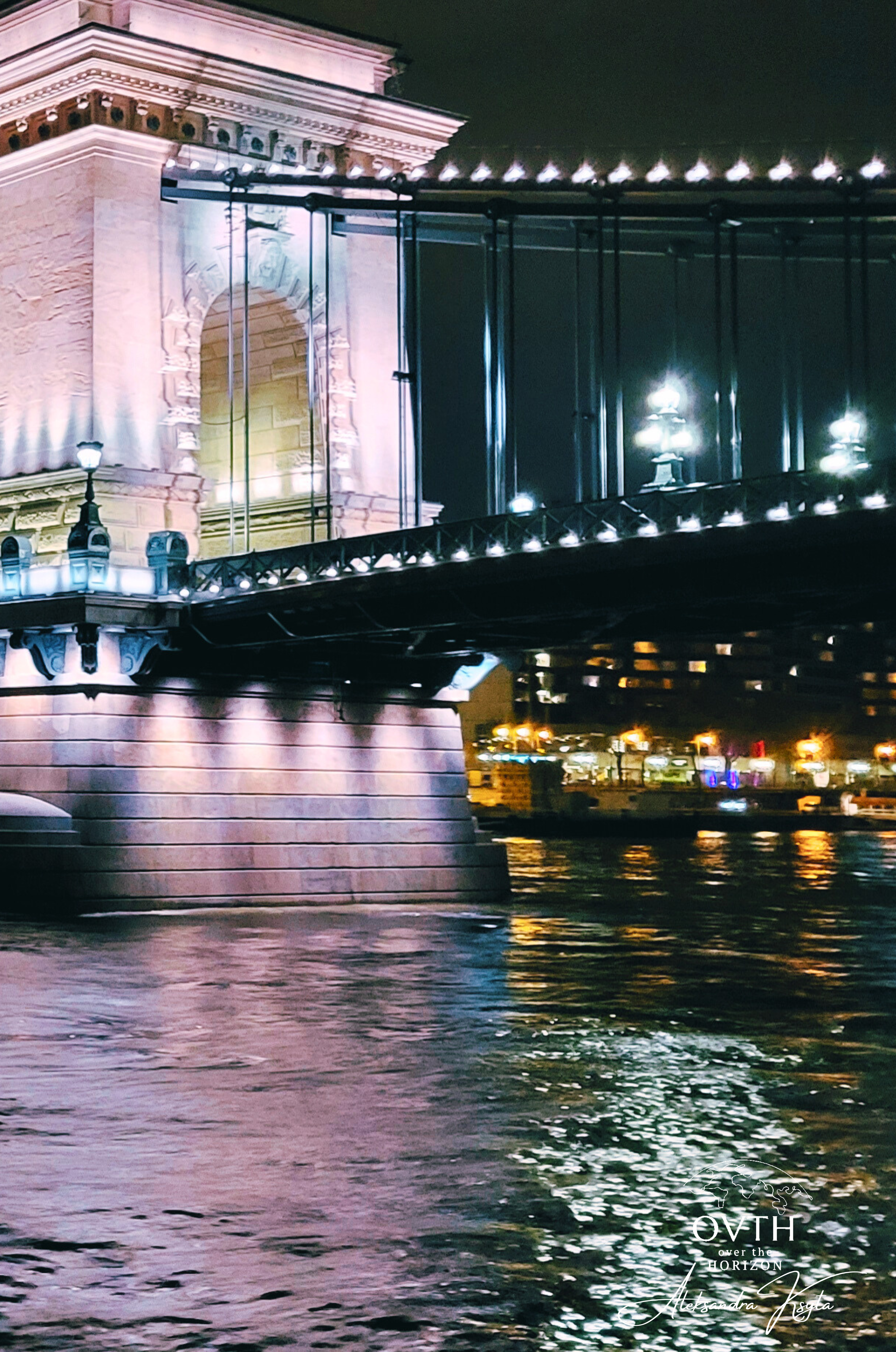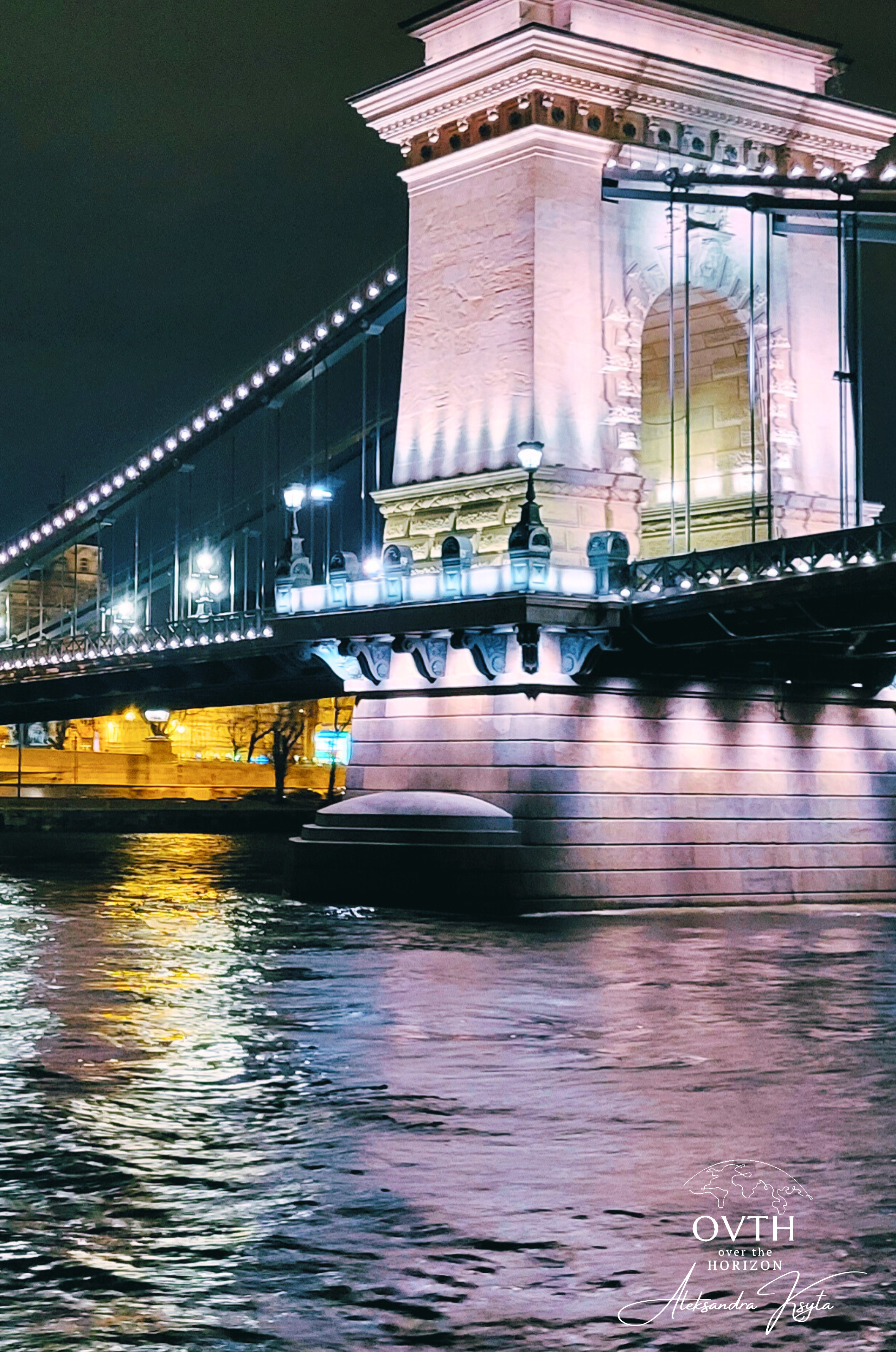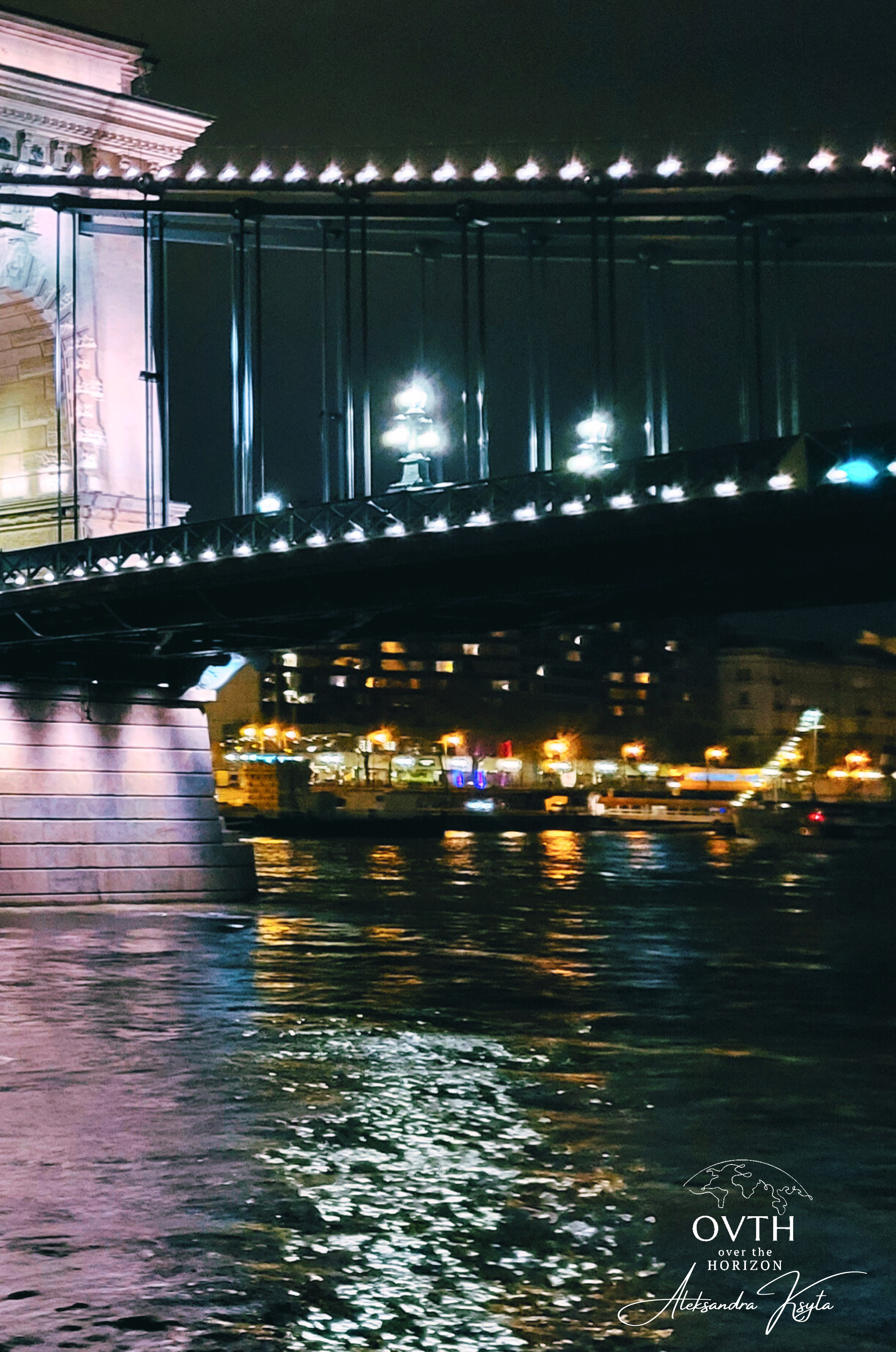 Nocą Most Łańcuchowy nabiera zupełnie innego wymiaru. Światło rozlewa się miękko po jego konstrukcji, a Dunaj odbija je jak spokojne lustro.