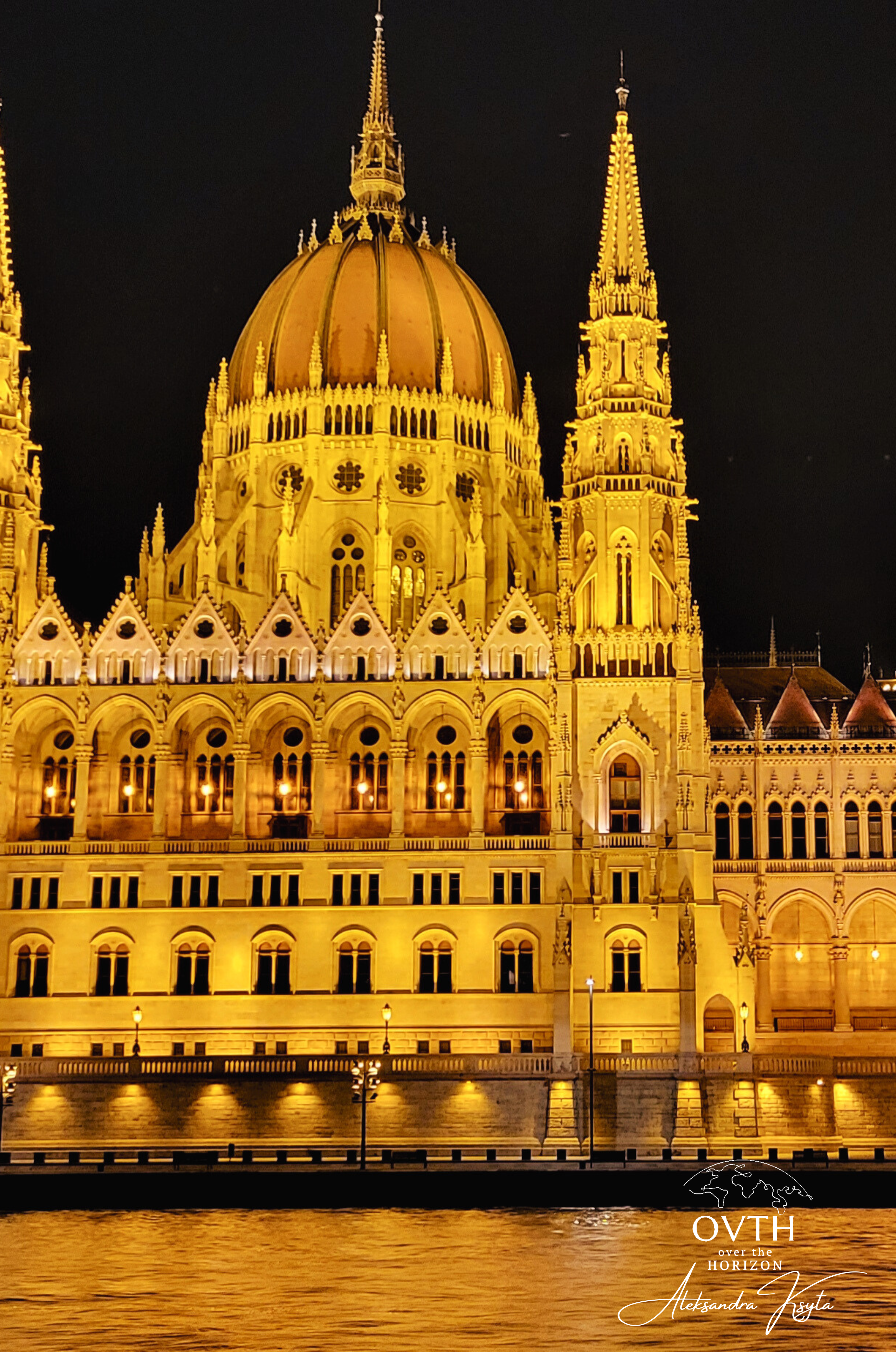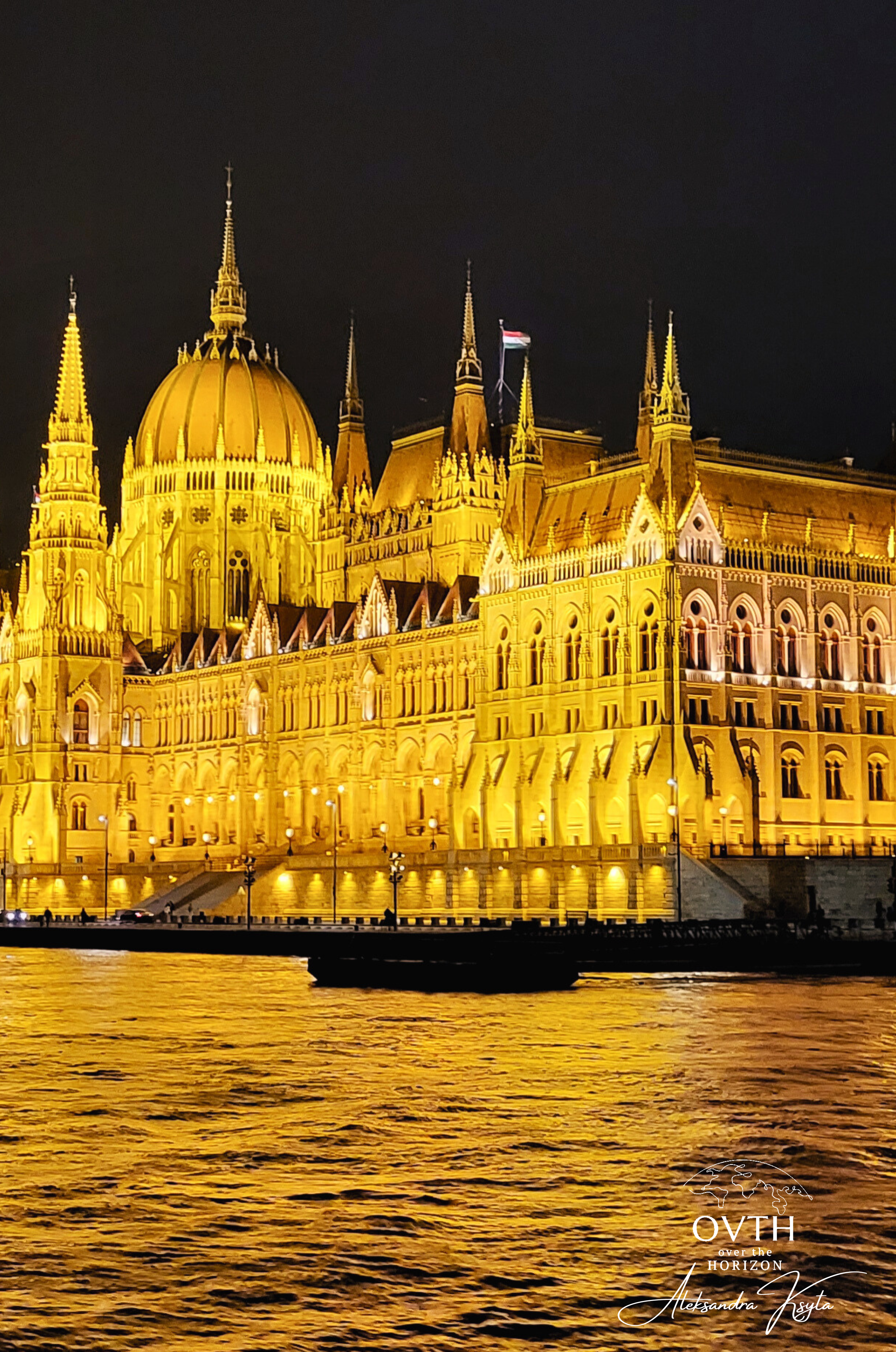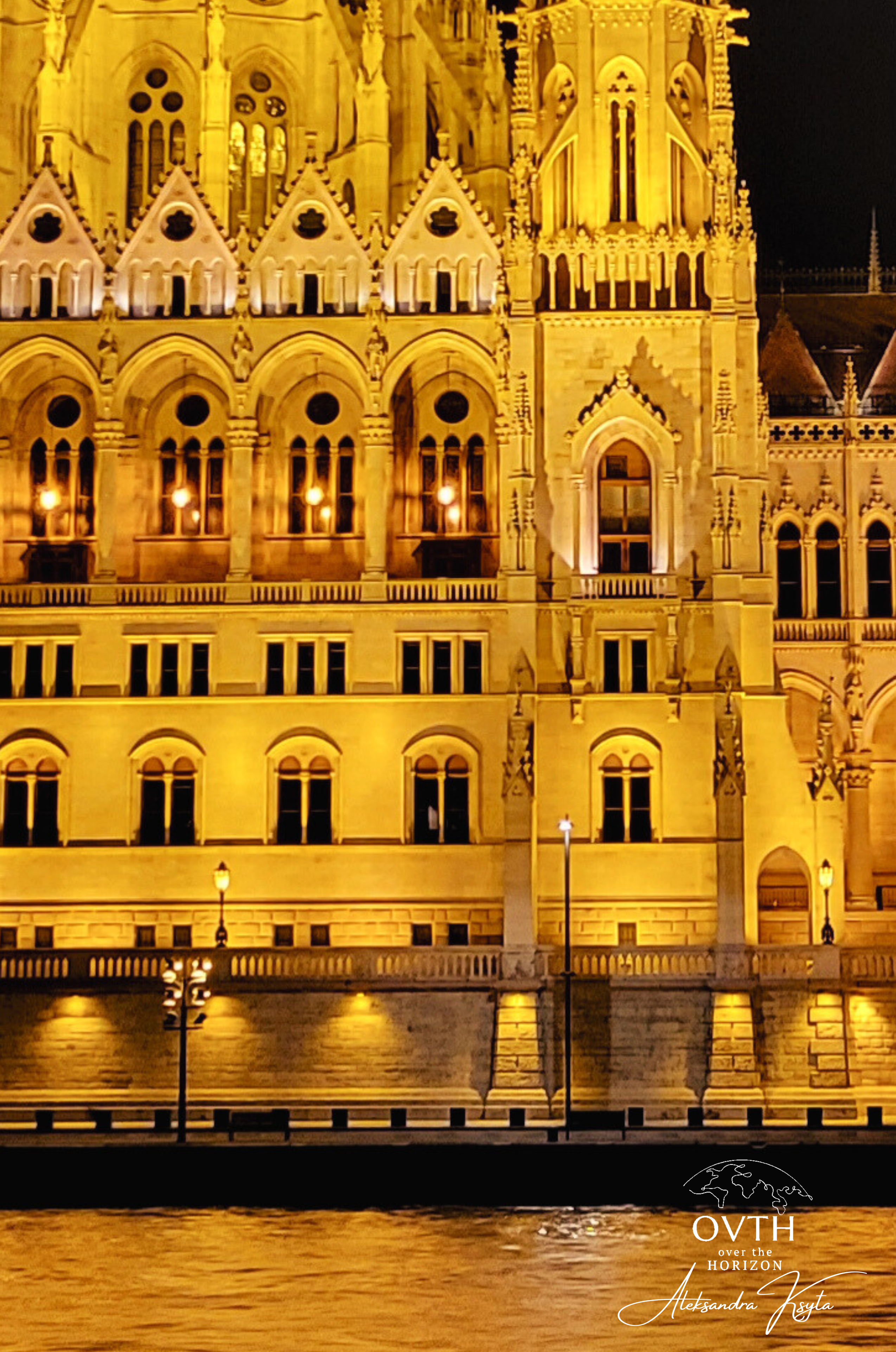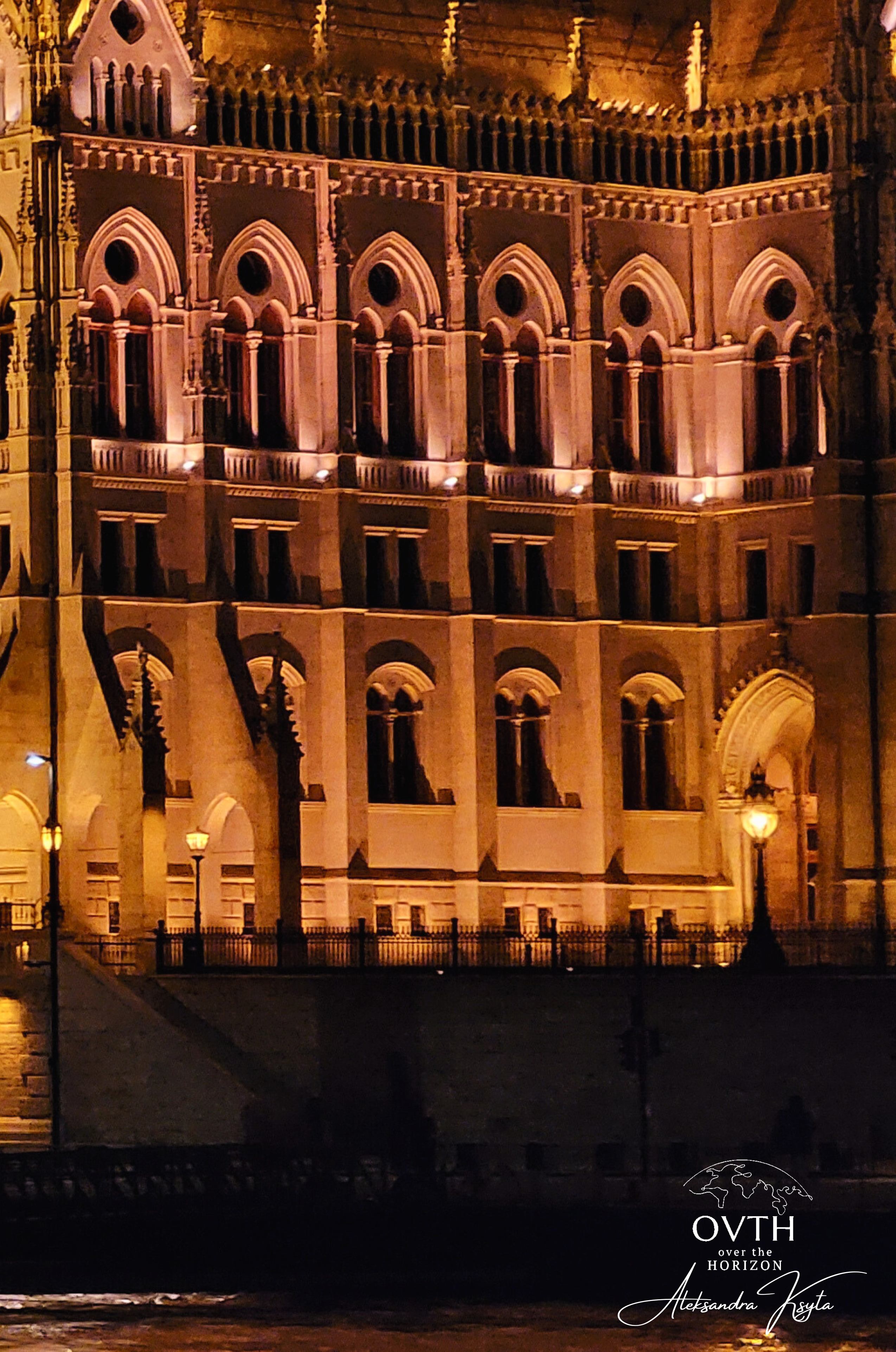 Miałam okazję podziwiać go nocą z poziomu Dunaju, gdy rozświetla się tysiącami świateł. Blask lamp odbijający się w chłodnej tafli wody nadaje jej ciepły, złoty i lekko różowy odcień, tworząc hipnotyzującą grę świateł w najróżniejszych tonacjach.