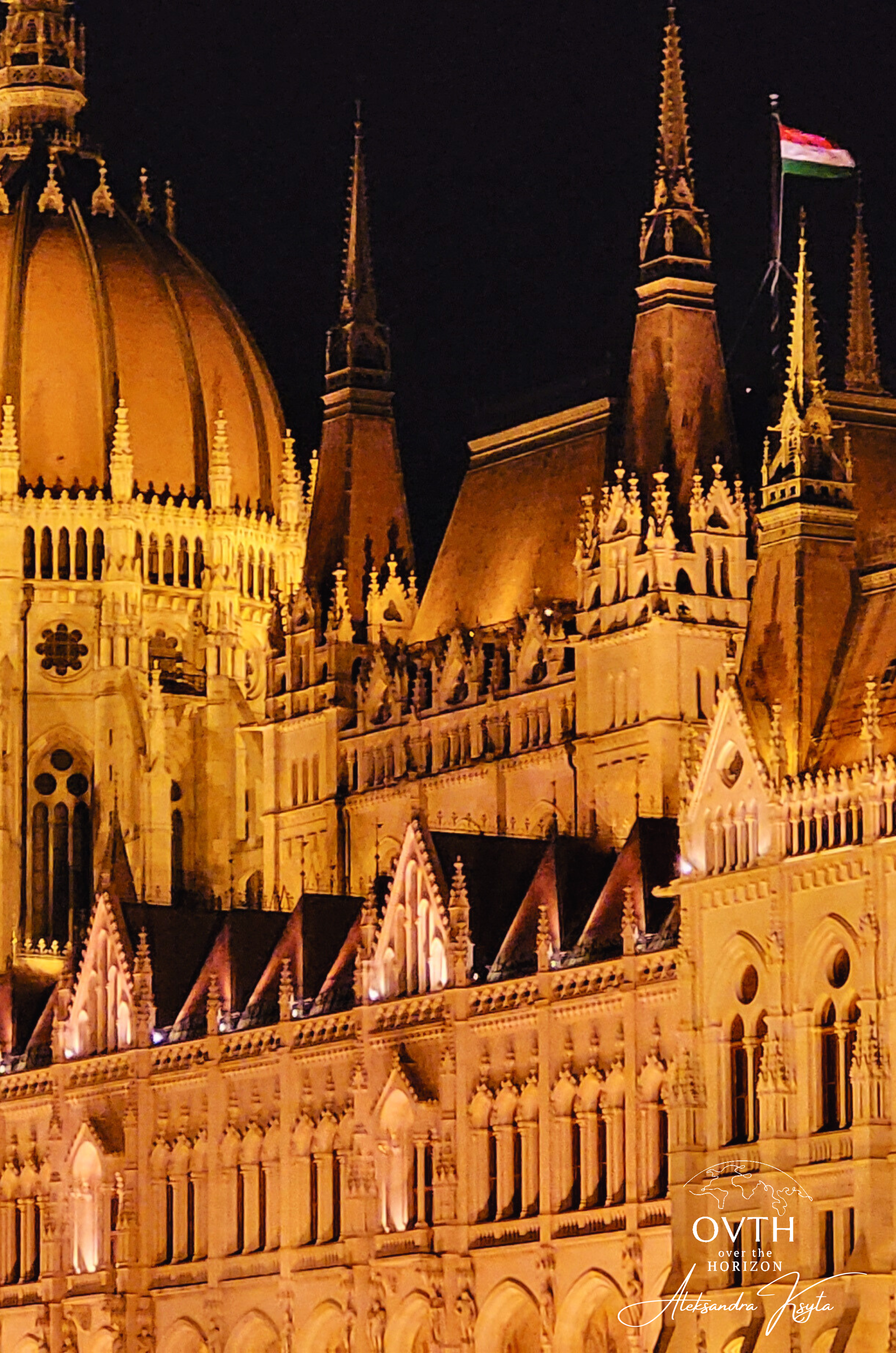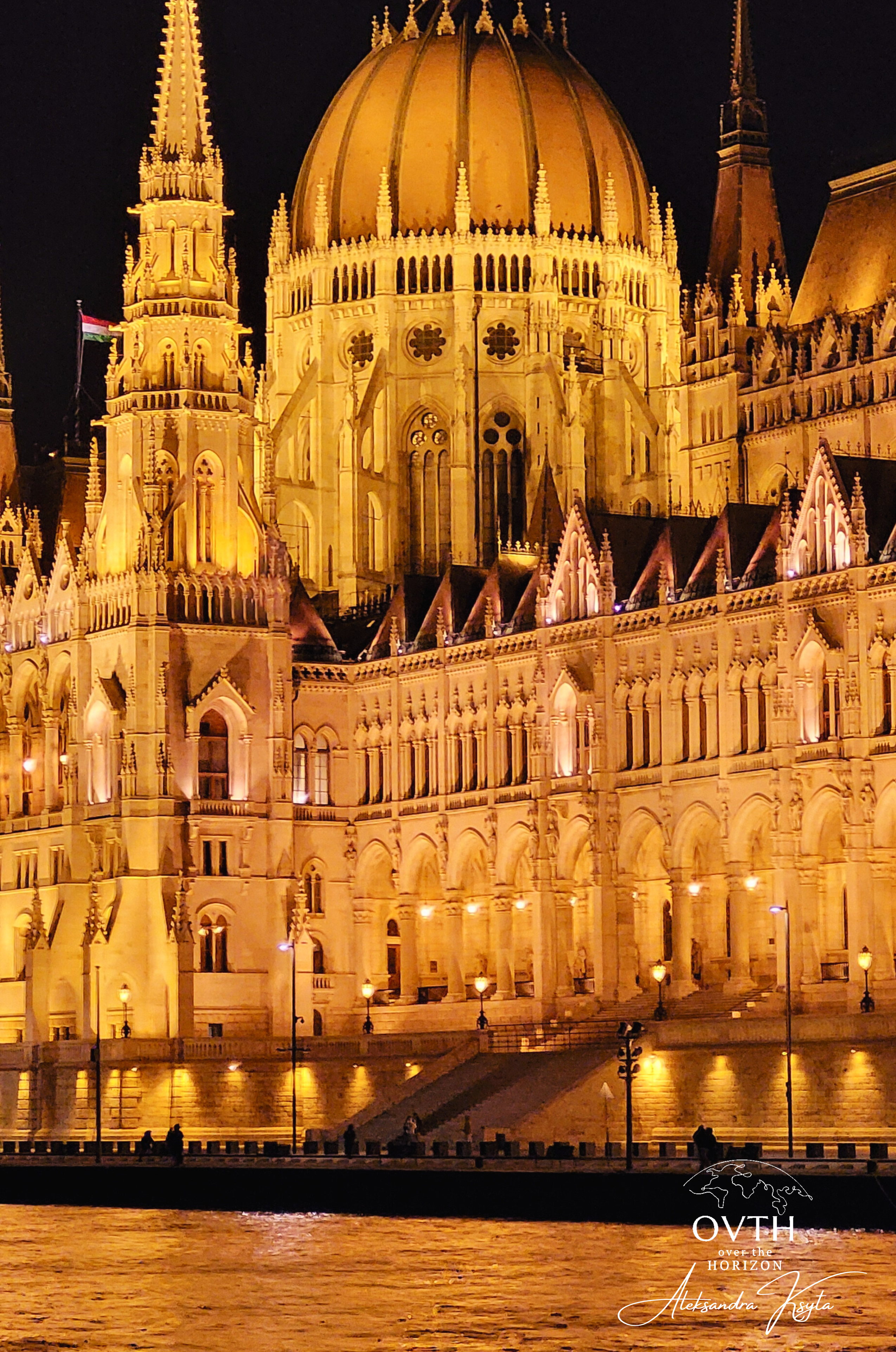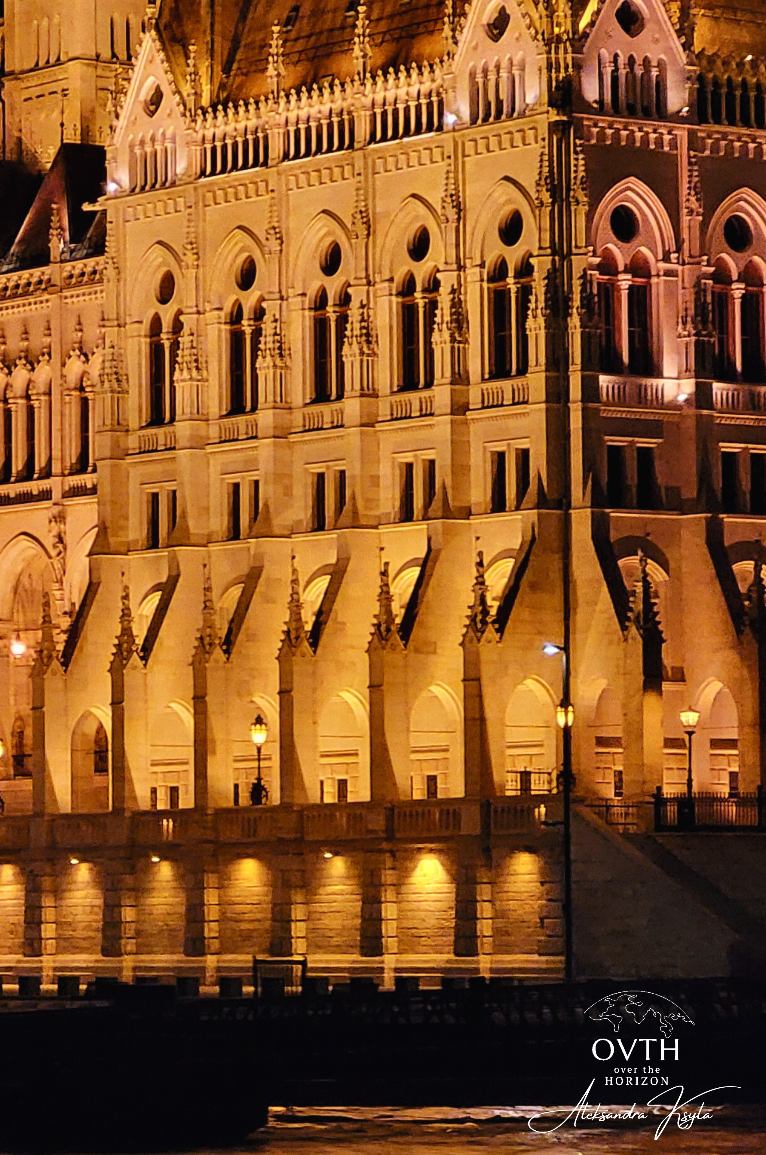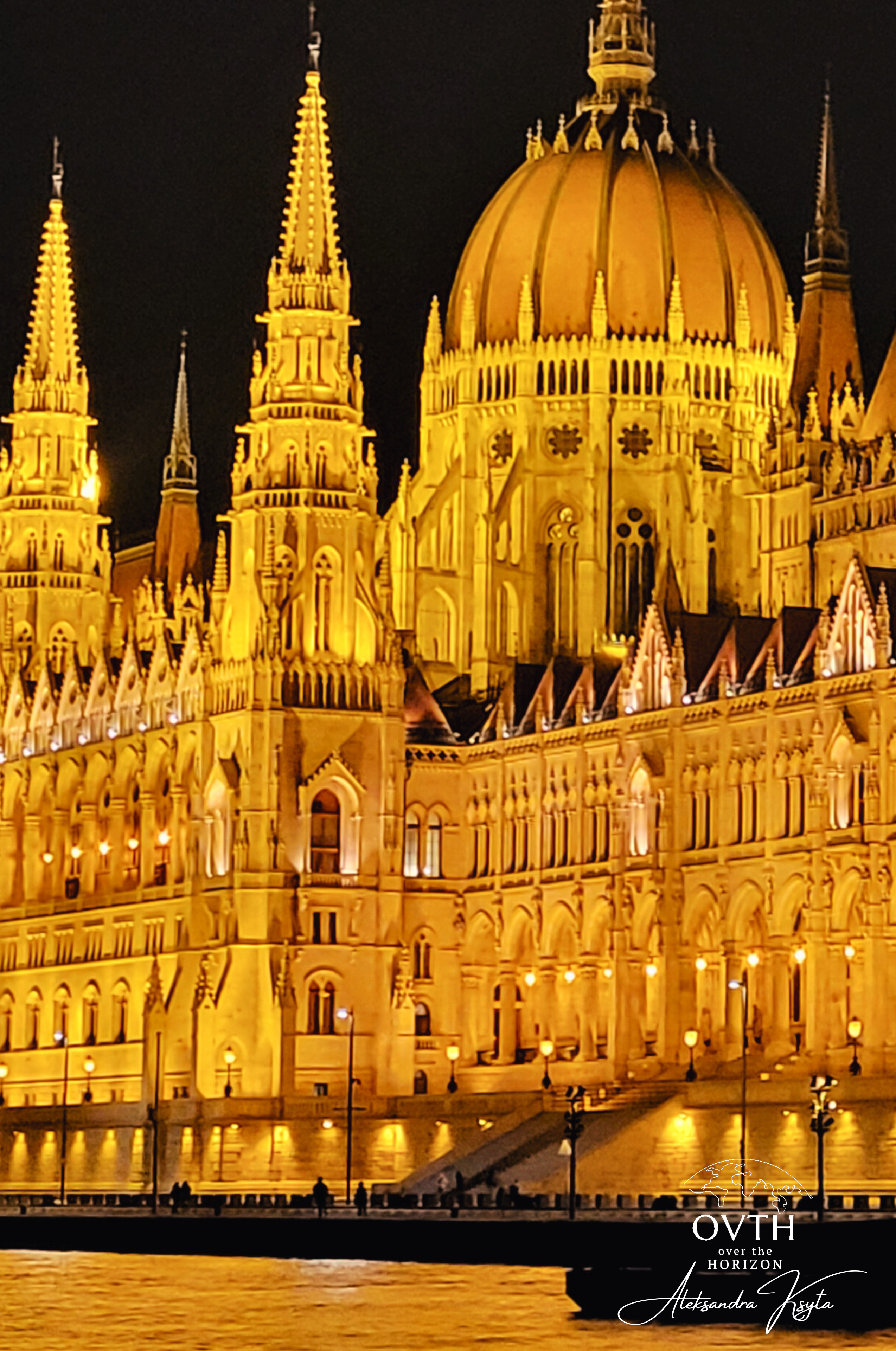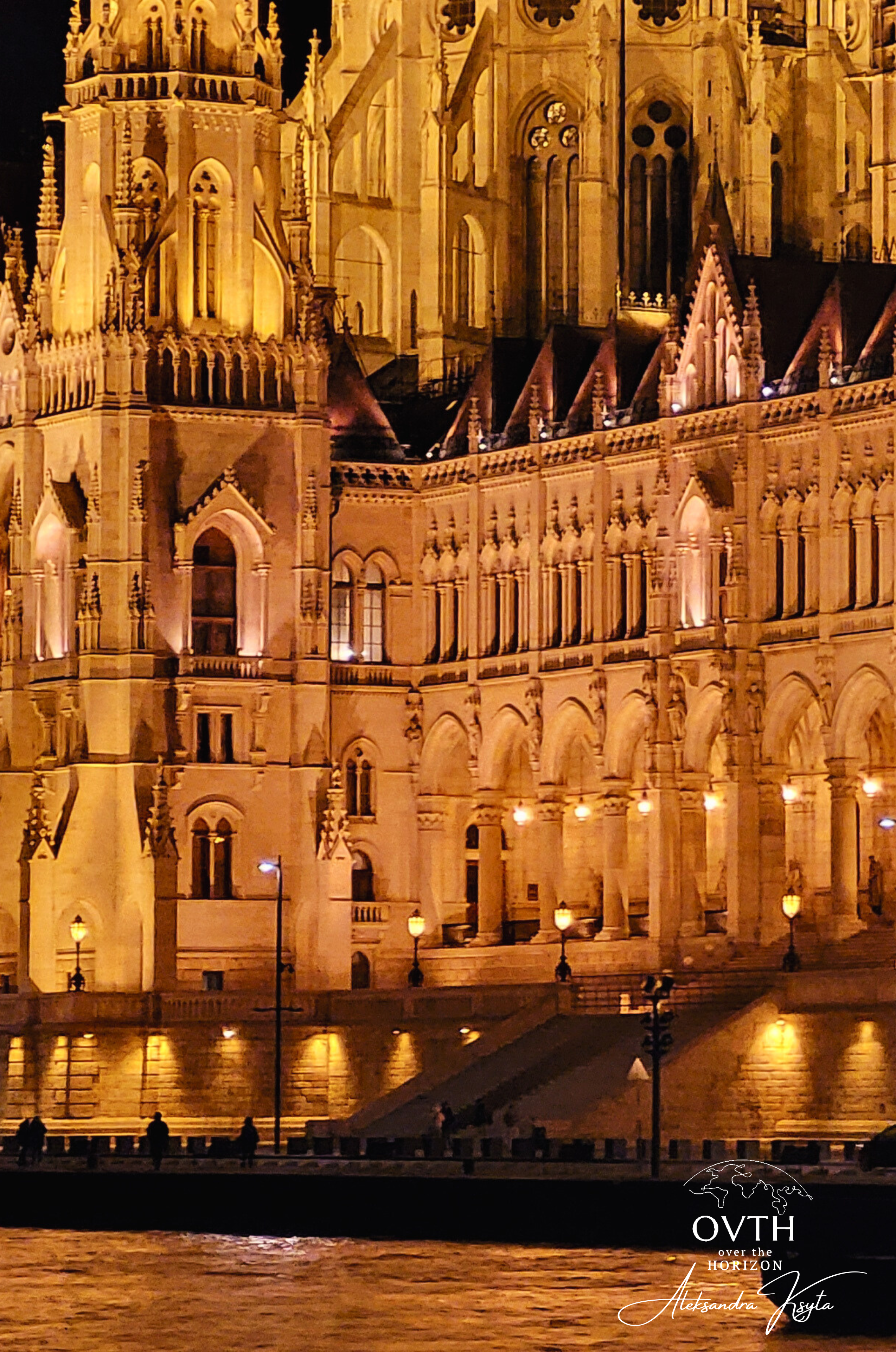 Miałam okazję podziwiać go nocą z poziomu Dunaju, gdy rozświetla się tysiącami świateł. Blask lamp odbijający się w chłodnej tafli wody nadaje jej ciepły, złoty i lekko różowy odcień, tworząc hipnotyzującą grę świateł w najróżniejszych tonacjach.