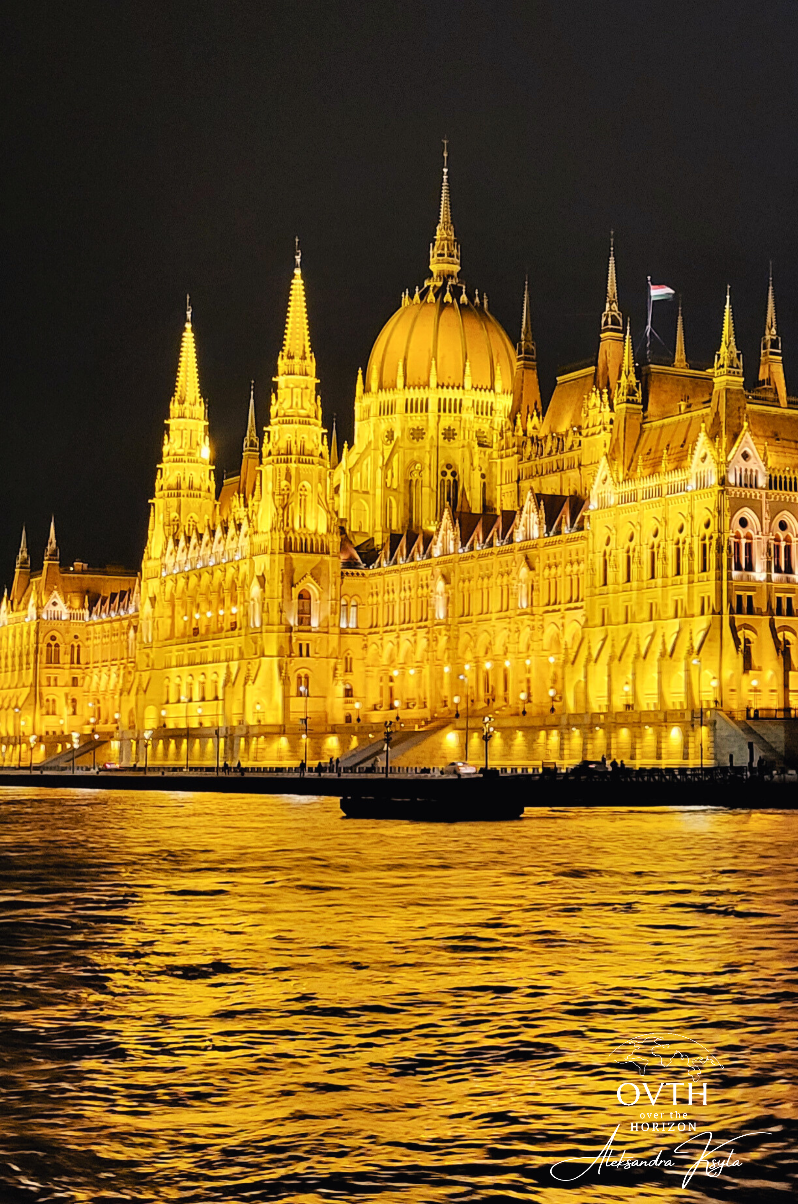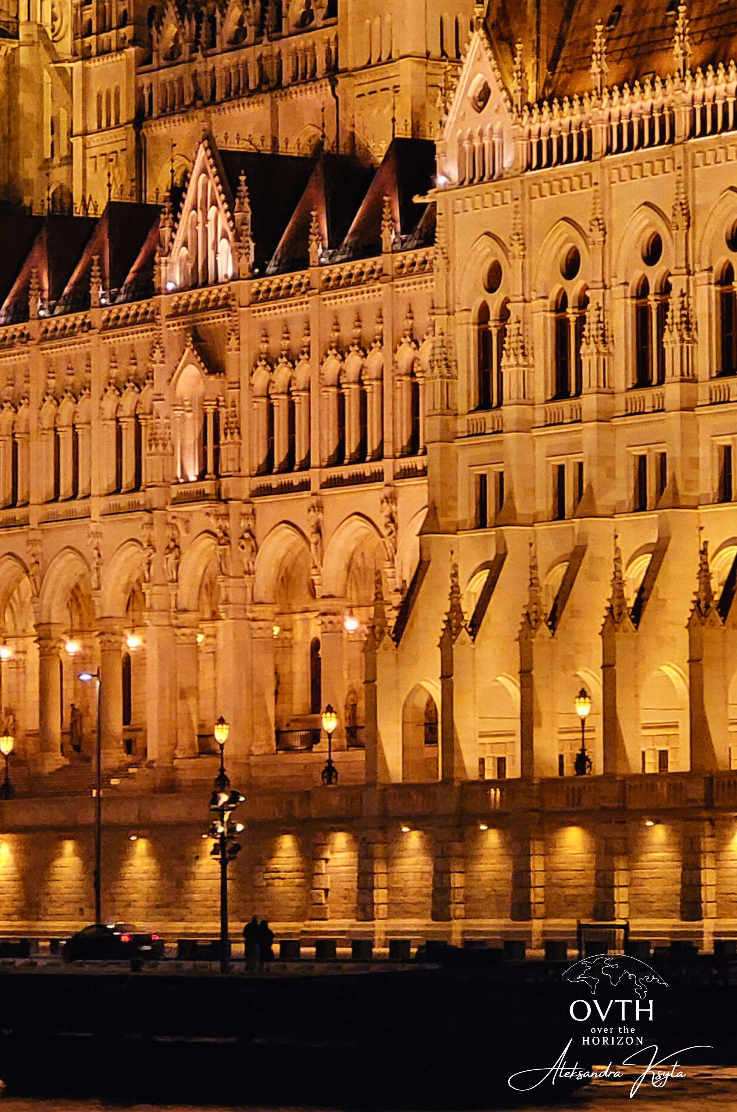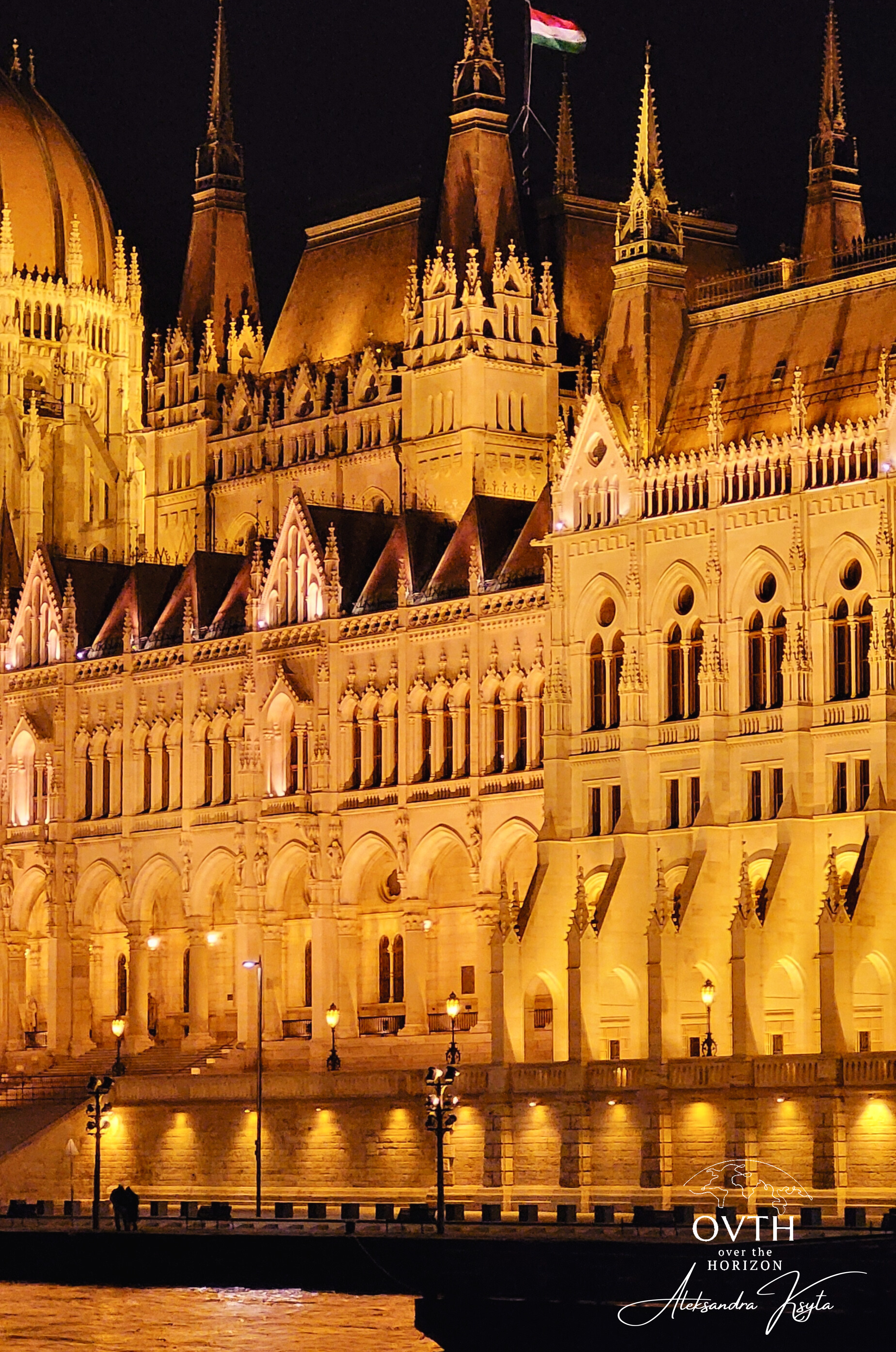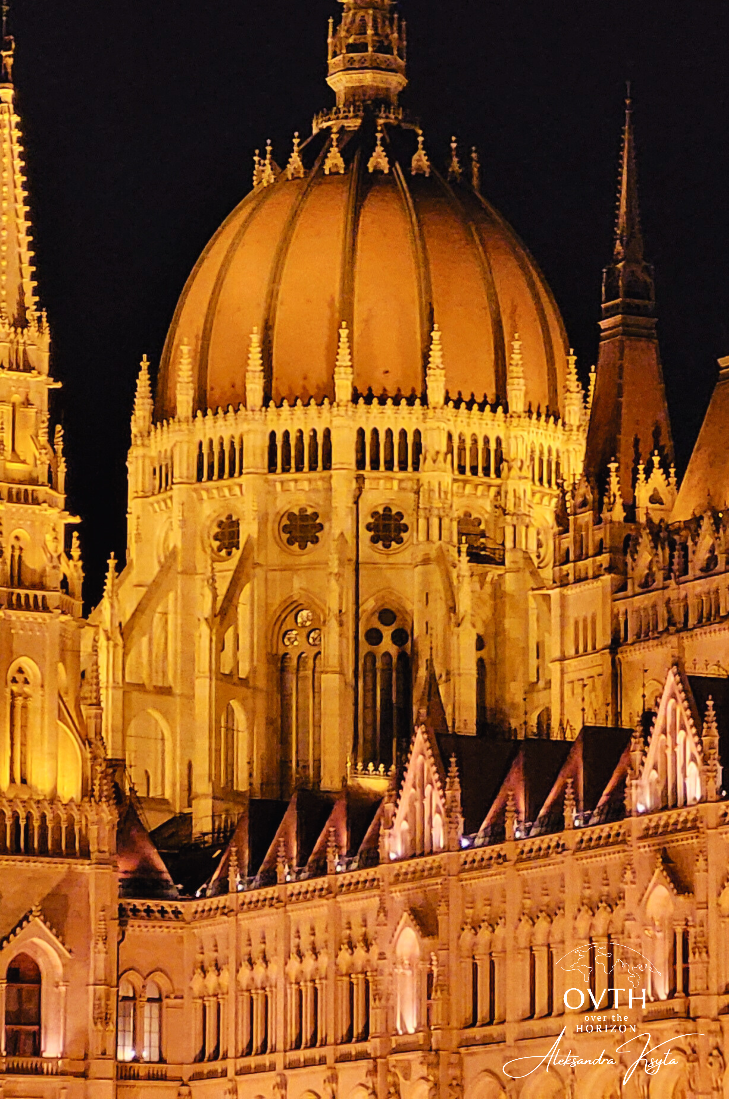Miałam okazję podziwiać go nocą z poziomu Dunaju, gdy rozświetla się tysiącami świateł. Blask lamp odbijający się w chłodnej tafli wody nadaje jej ciepły, złoty i lekko różowy odcień, tworząc hipnotyzującą grę świateł w najróżniejszych tonacjach.