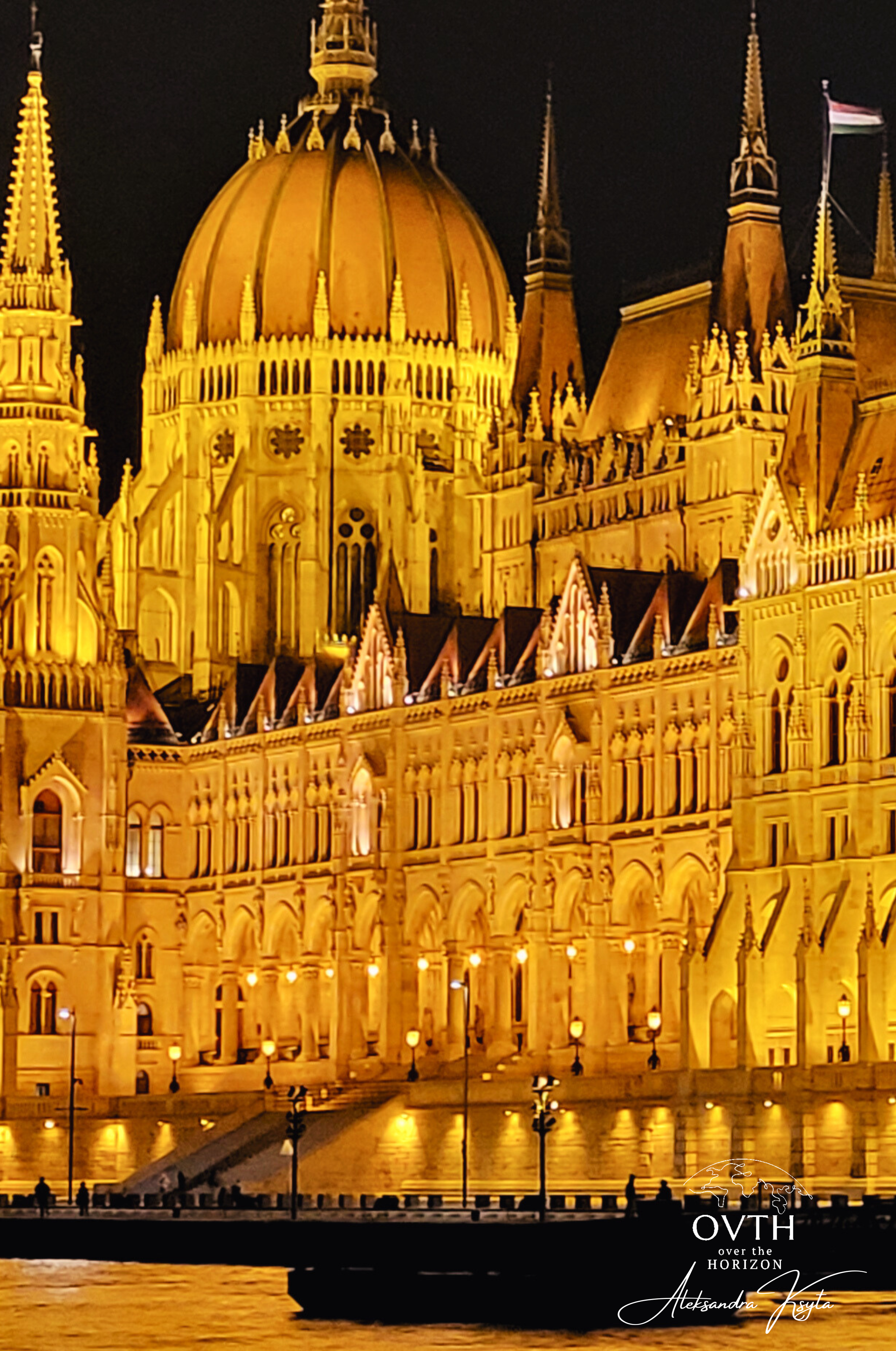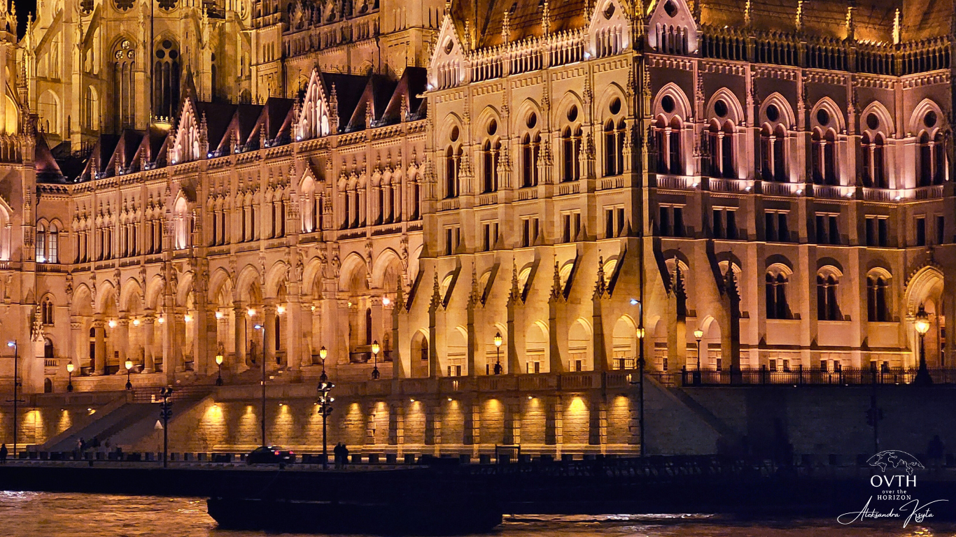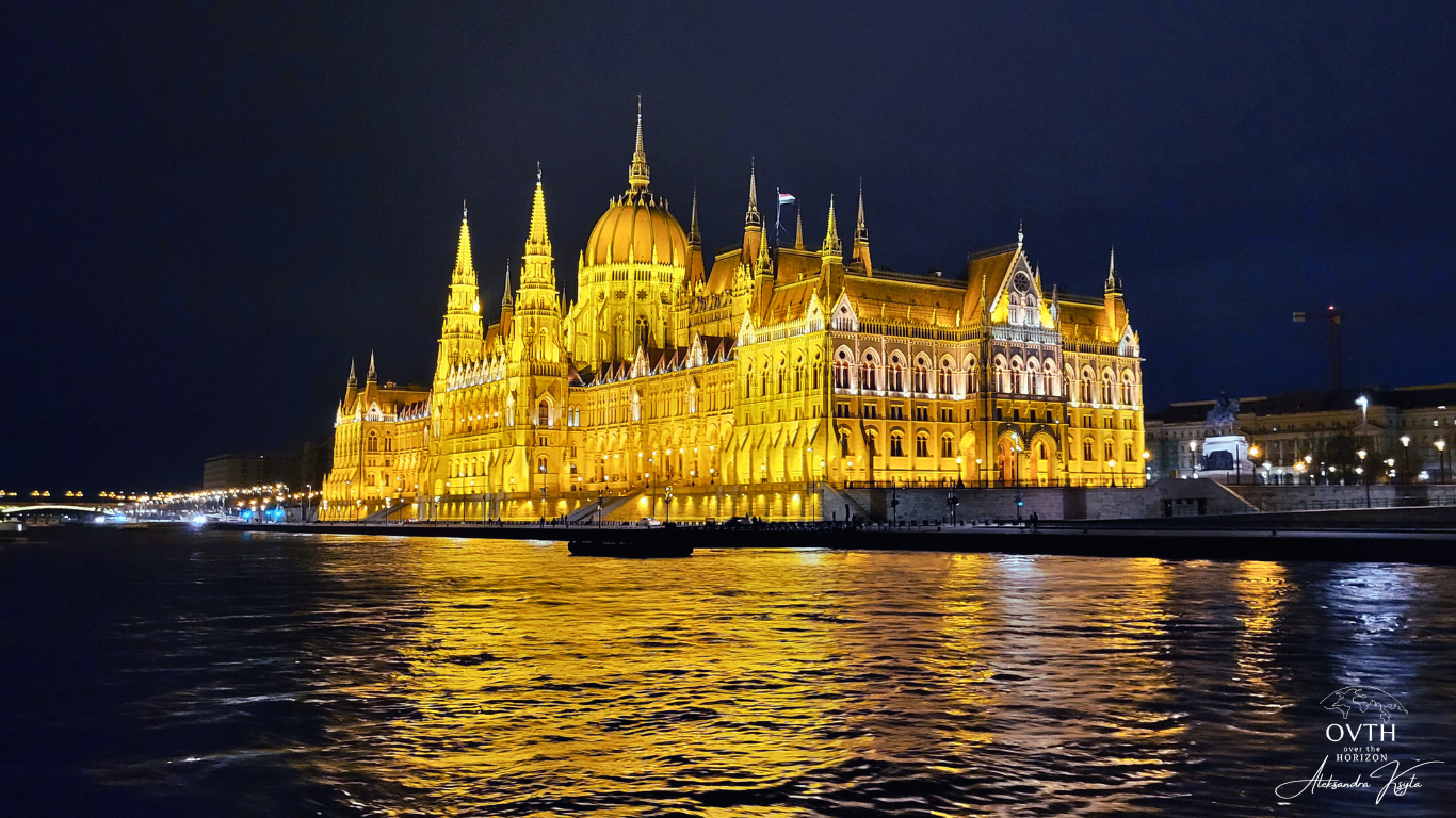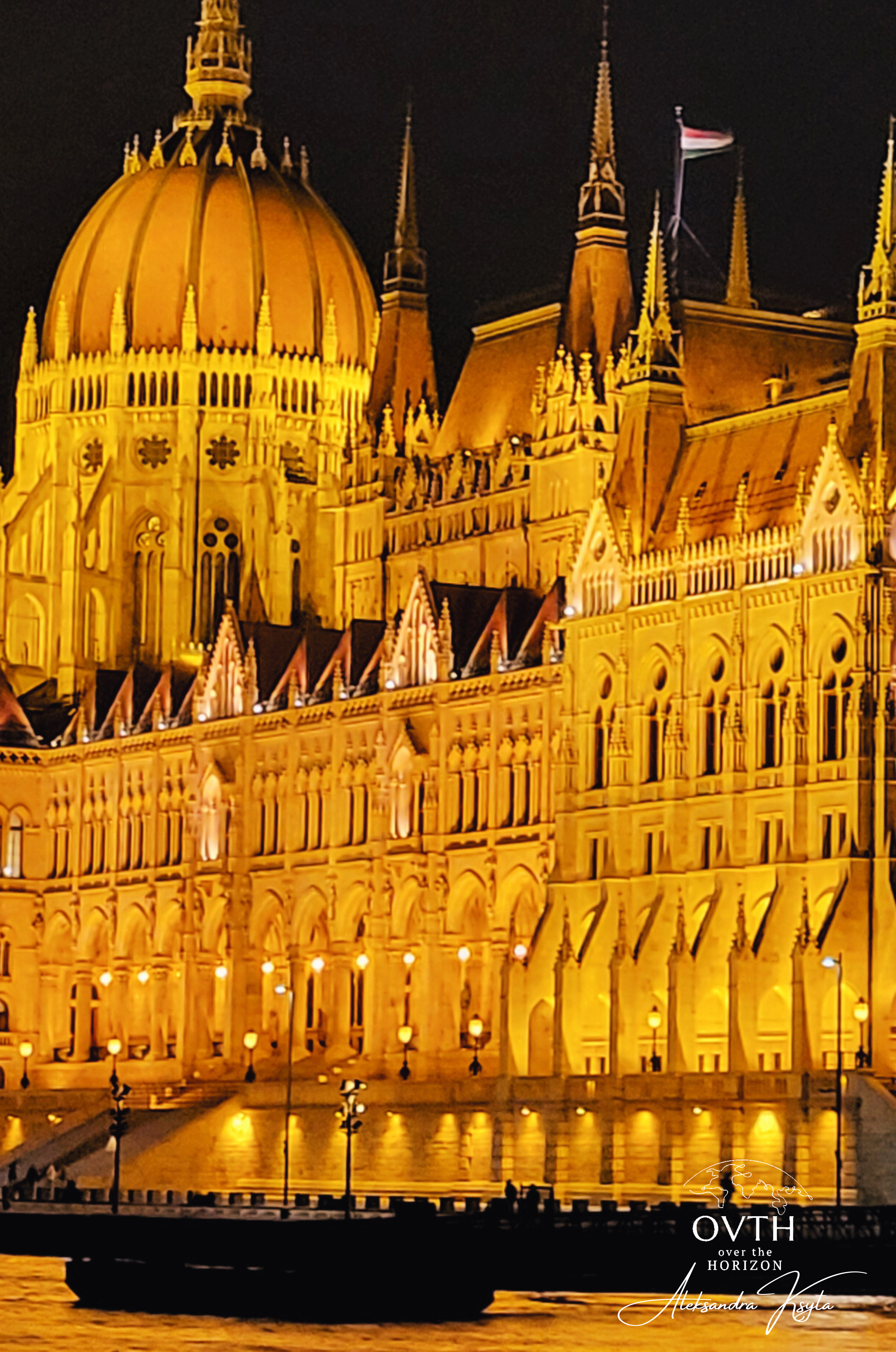 Miałam okazję podziwiać go nocą z poziomu Dunaju, gdy rozświetla się tysiącami świateł. Blask lamp odbijający się w chłodnej tafli wody nadaje jej ciepły, złoty i lekko różowy odcień, tworząc hipnotyzującą grę świateł w najróżniejszych tonacjach.