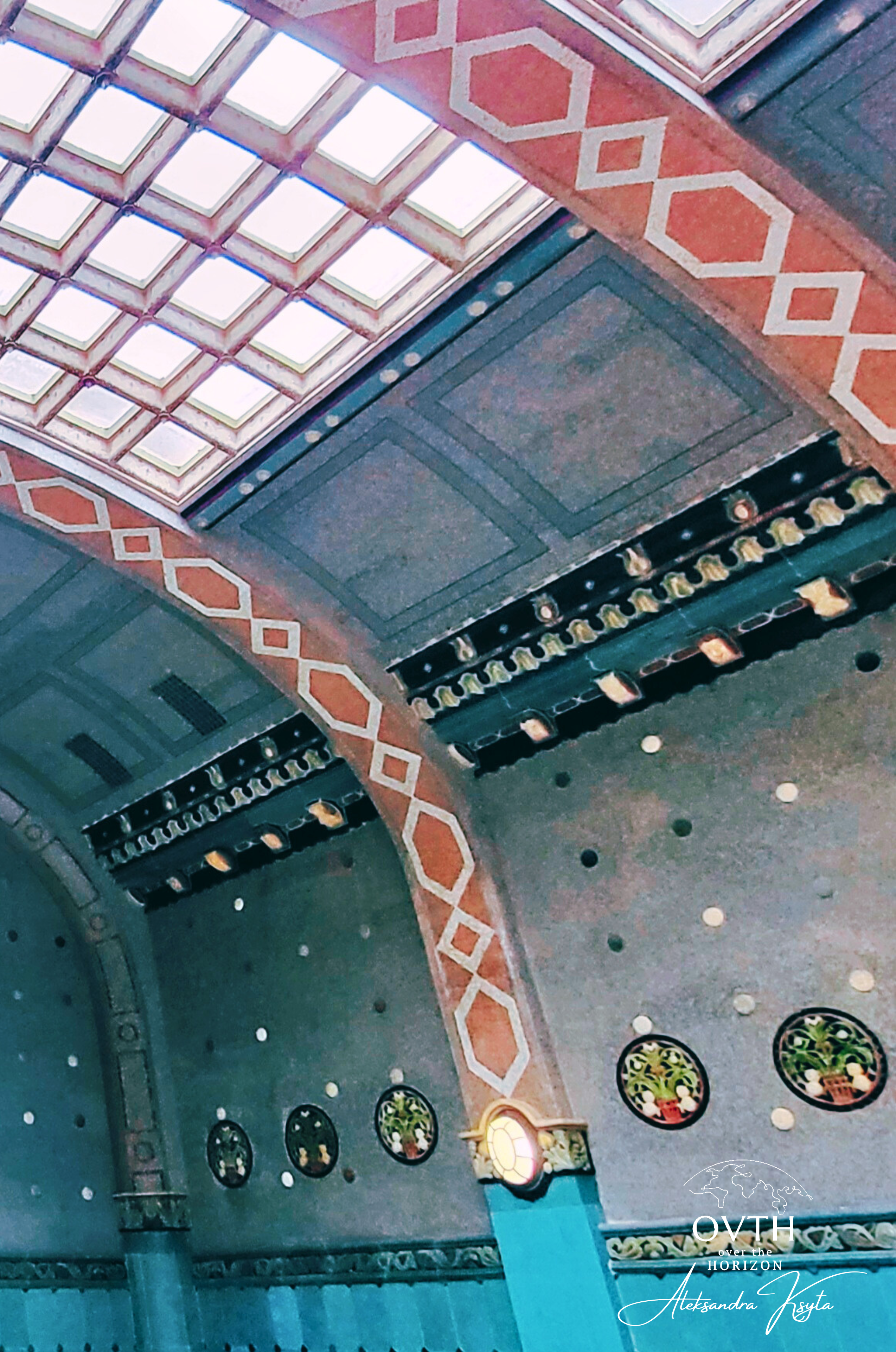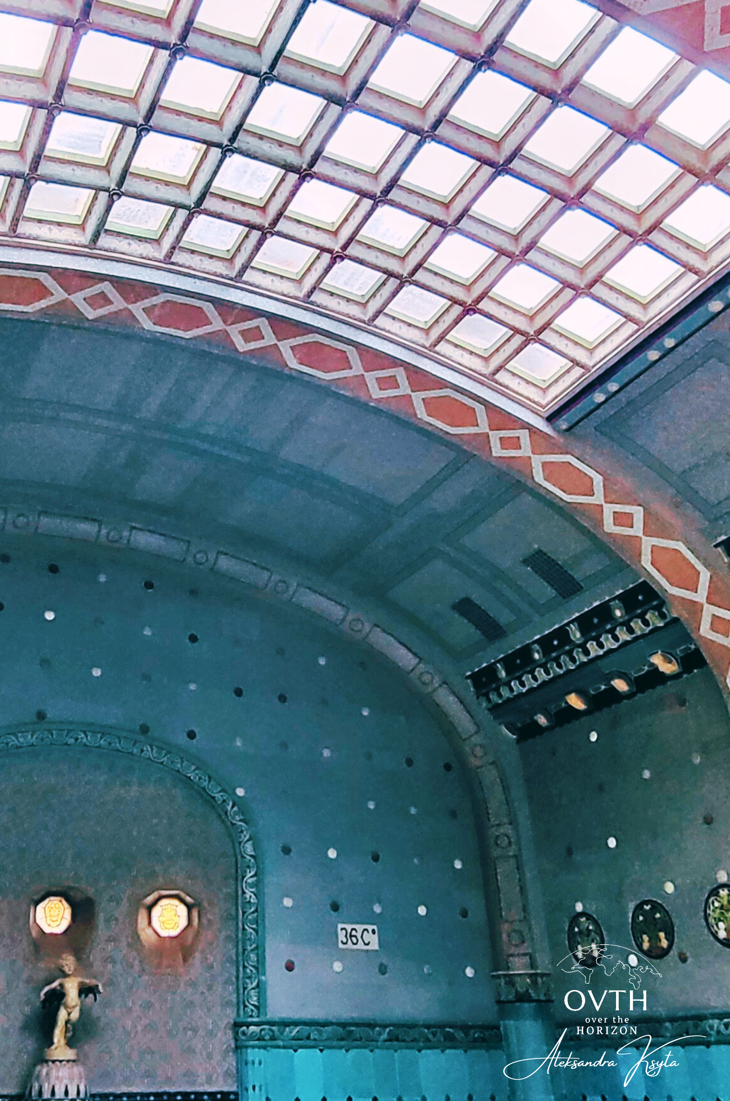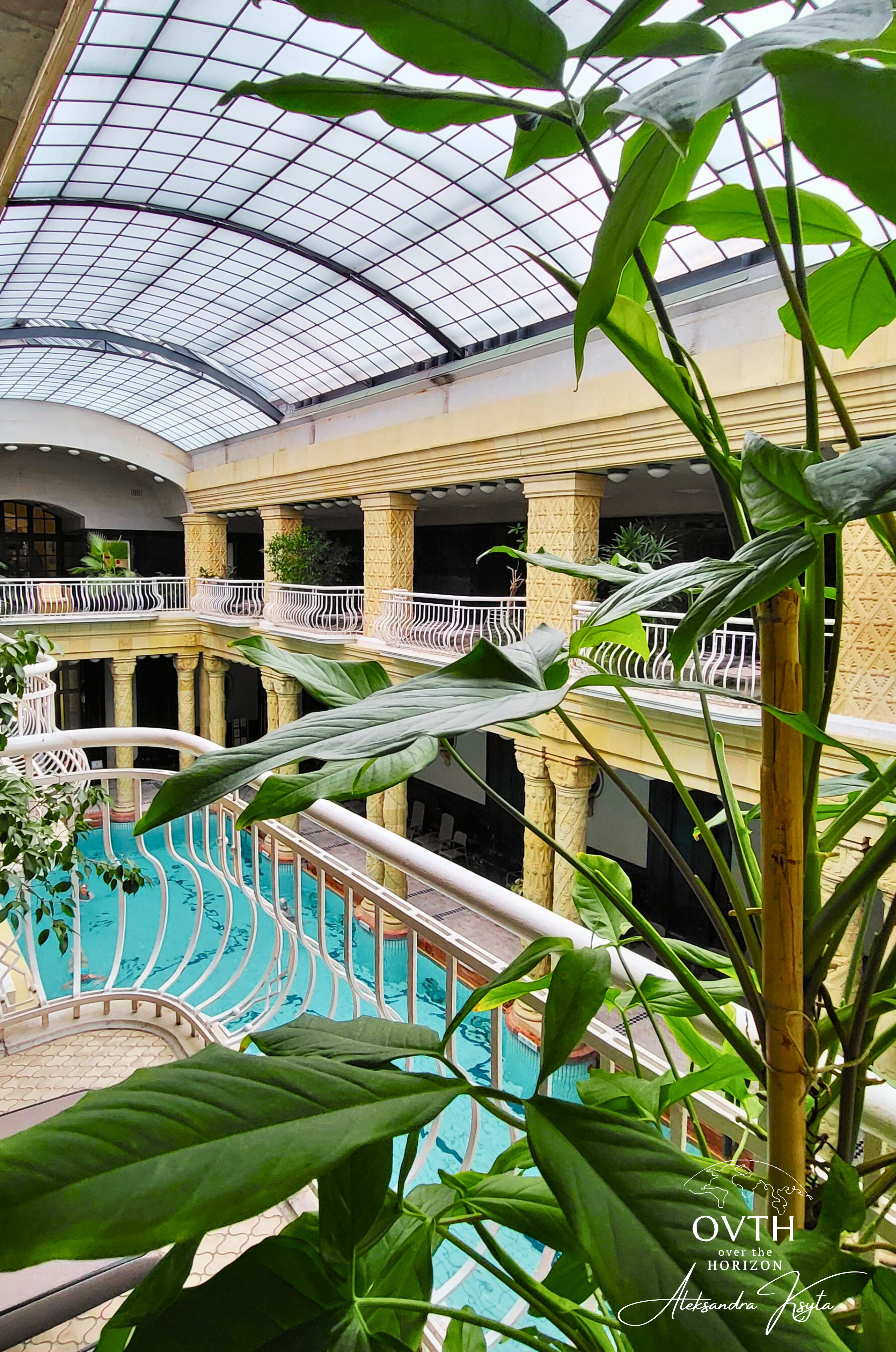 Oprócz leczniczych korzyści, nie umknęła mojej uwadze architektura tego miejsca. Rozkoszując się kąpielą w basenie głównego holu, dostrzec możemy dumnie wyrastające spod tafli wody kolumnady, nad nimi ozdobne balkony otoczone zielenią, a gdy zadrzemy głowę jeszcze wyżej, podziwiać możemy szklany sufit w formie kopuły, przez który wpada miękkie światło.