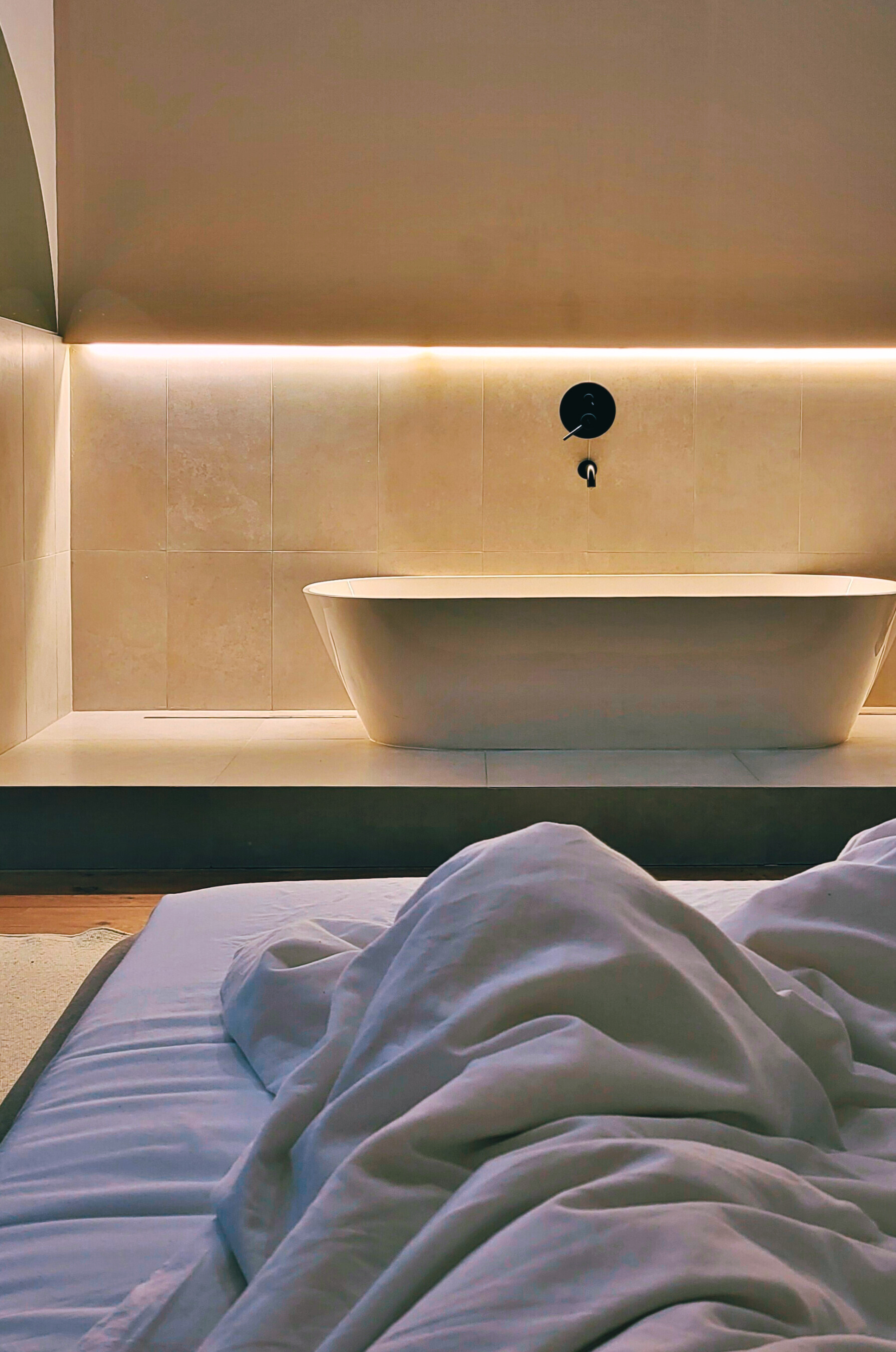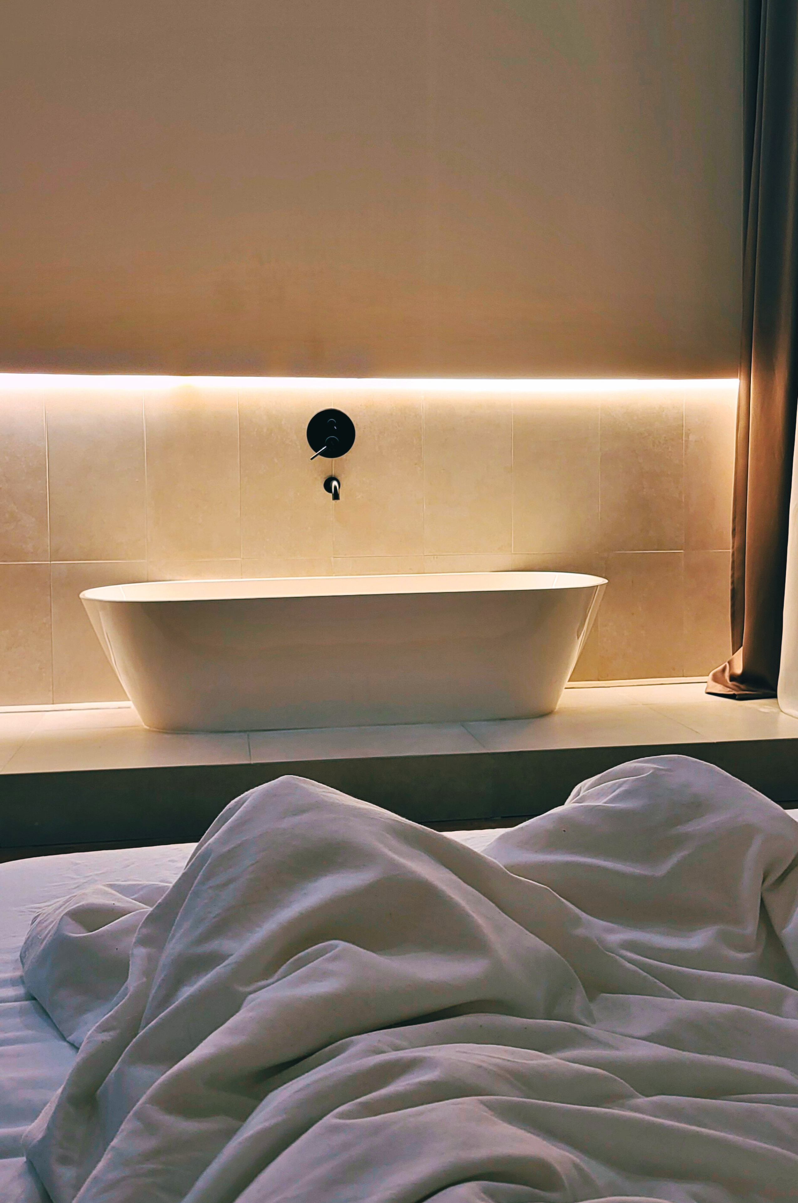 Ciepła kąpiel po całym dniu spacerów i złote światło miasta odbijające się w wodzie sprawiły, że czas na chwilę przestał dla nas istnieć. Byliśmy tylko my, przygaszone światło i spokojny rytm nocnego miasta.